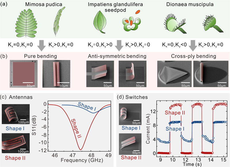 图1(a)三种植物形态变形的概念概述,以及(b)相应的人造微纳结构的形态变形。(c)隐蔽天线。左图分别为I型和II型天线的SEM图像。右图分别显示了形状I和形状II相对于频率的回波损耗(S11)。(d)双功能开关。左图分别为I型和II型开关的SEM图像。右图显示了以激光照射作为开关的通断电流变化。红色线和蓝色线分别代表形状I和形状II。
