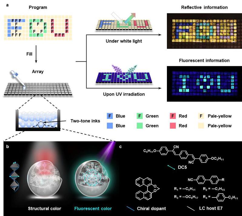 针对上述挑战,性爱网 俞燕蕾教授团队报道了一种利用胆甾相液晶光子晶体的结构色代替荧光材料染料色的策略,开发了反射颜色可调、荧光性质稳定的“双色”光子墨水。墨水的反射颜色由光子晶体“外衣”——胆甾相液晶中的螺旋超结构决定,而荧光颜色依然由荧光材料的分子结构决定,利用其构筑的双重标签在反射和荧光模式下显示出完整的不同图案(图1),这是单一荧光分子或光子晶体材料难以实现的功能。