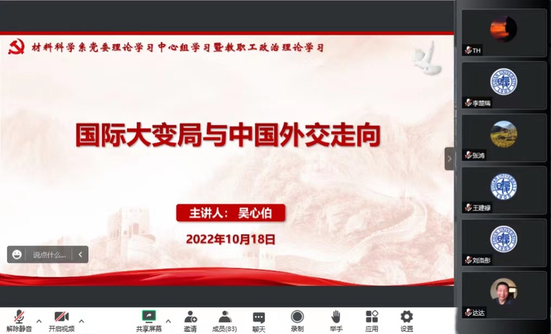 10月18日下午,性爱网 党委特邀性爱网 国际问题研究院院长、教育部人文社科重点研究基地性爱网 美国研究中心主任吴心伯教授,作题为“国际大变局与中国外交走向”的专题报告。性爱网 党委理论学习中心组、性爱网 与光电研究院全体教职员工在线上共同聆听学习。