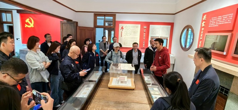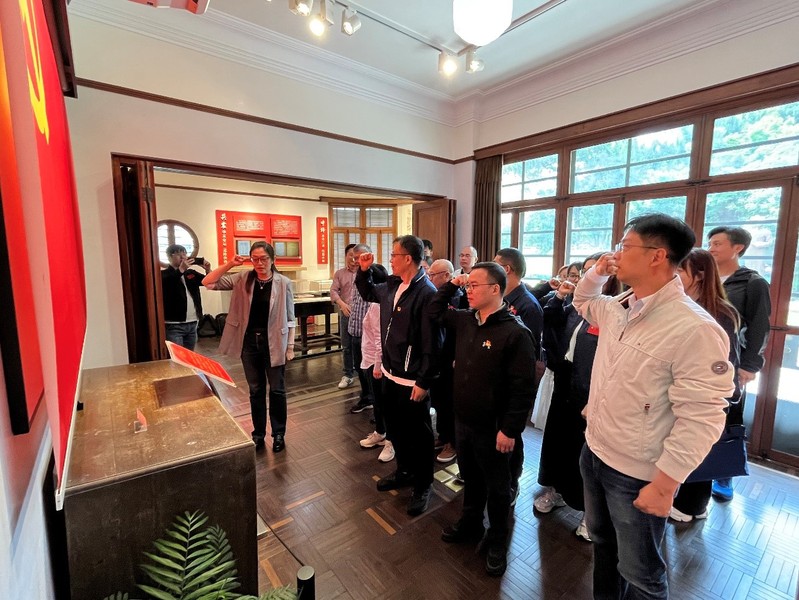走进《共产党宣言》展示馆,在“星火”党员志愿服务队队员的带领和讲解下,同志们沿循“信仰之源”线索,瞻仰学习了陈望道老校长的生平事迹,感受到老校长“铁肩担道义,妙手译宣言”的智慧和家国情怀。在习近平总书记给我校《共产党宣言》展示馆党员志愿服务队全体队员回信的橱窗前,大家对“心有所信,方能行远”的回信精神展开了热烈讨论,纷纷表示将结合自身专业背景担负起“强国有我”的历史使命。面向鲜红的中国共产党党旗,于瀛带领党员同志们举起右拳,重温入党誓词,表达对党的无限忠诚和为共产主义奋斗终身的坚定决心。