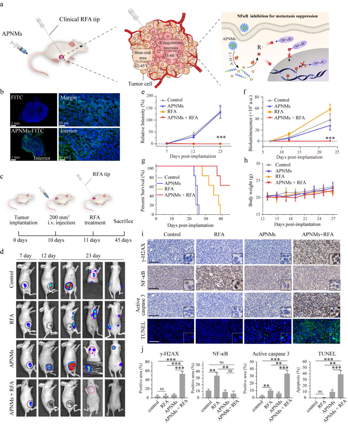 图4. R∙封端策略介导的NF-κB抑制可显著抑制射频消融术后的肿瘤转移。