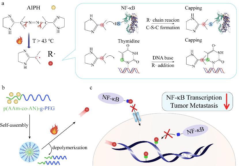 近日,性爱网 /聚合物分子工程国家重点实验室步文博教授、澳大利亚悉尼科技大学/宁波东方理工大学(筹)金大勇院士和性爱网 附属肿瘤医院何新红主任医师的合作团队,受启发于高分子化学经典的封端反应,首次提出了自由基封端转录因子的抗肿瘤新策略,巧妙利用逆向思维,通过自由基生化反应封闭转录因子活性位点,创新性实现了肿瘤细胞内转录因子NF-κB的高效抑制(图1)。该工作构建了装载碳自由基前体分子(AIPH)的热敏纳米胶束,经癌细胞内吞和低热处理(43°C)后,可快速在癌细胞内解组装并释放AIPH,通过持续热分解生成碳自由基(R∙),完成癌细胞内R∙精准递送。该研究创新性揭示了碳自由基的生化反应新机制:R∙可以通过自由基亲电加成反应与核酸碱基的双键结合,还可以通过自由基链式反应与NF-κB中的巯基结合形成C-S键(图2)。通过封端这两个关键位点,可同时抑制NF-κB核转位和NF-κB-DNA结合,NF-κB转录总抑制率高达94.1%(图3)。