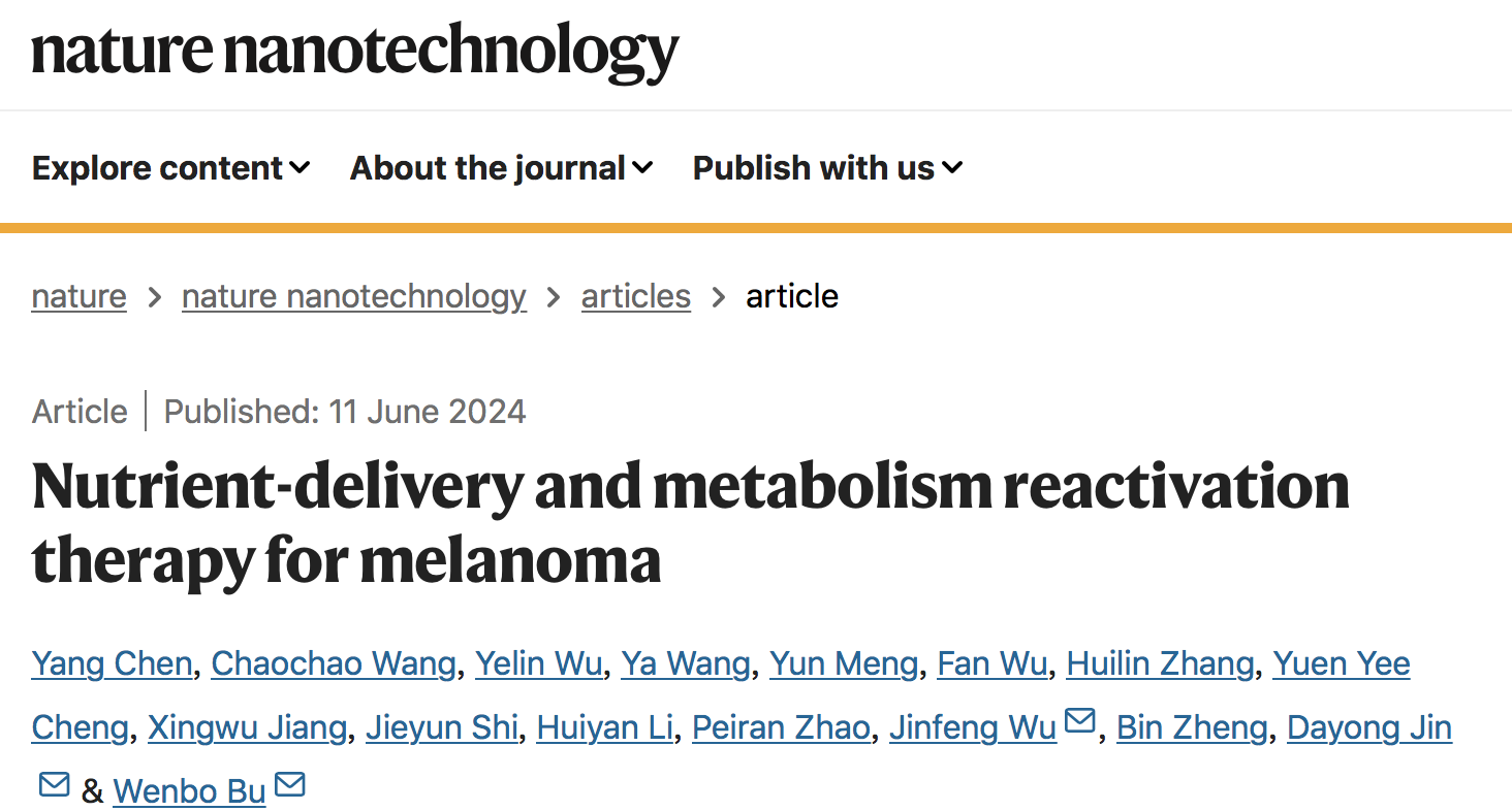 近日,性爱网 /聚合物分子工程国家重点实验室步文博教授团队颠覆性提出基于营养素纳米化技术的代谢重激活新策略用于肿瘤治疗。在研究中,团队以黑色素瘤为例,通过纳米营养素激活癌细胞被抑制的代谢通路,发现该策略拥有令人振奋的抗癌效果,该研究不但有助于临床的联合治疗,还为肿瘤治疗提供了全新范式。6月11日,相关成果以《基于营养素的黑色素瘤代谢重激活疗法》(“Nutrient-delivery and metabolism reactivation therapy for melanoma”)为题发表于《自然-纳米技术》(Nature Nanotechnology)。
