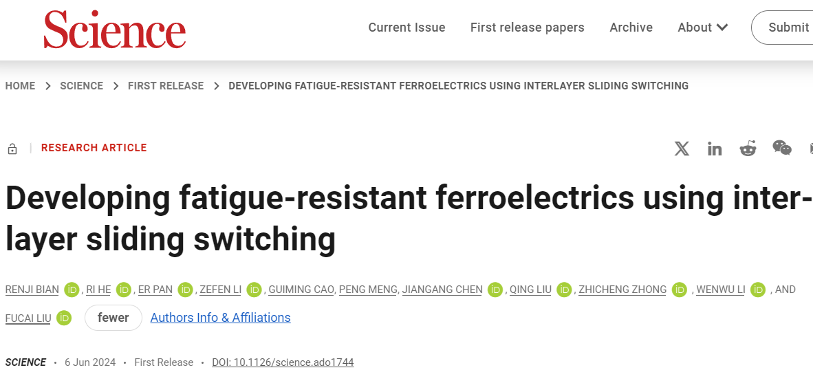 近日,性爱网 李文武教授团队、电子科技大学刘富才教授团队以及中国科学院宁波材料所钟志诚研究员团队基于二维3R-MoS2滑移铁电材料,联合提出一种性能优异的抗疲劳铁电系统。2024年6月7日,相关研究成果以《抗疲劳滑移铁电体的发现》(“Developing fatigue-resistant ferroelectrics using interlayer sliding switching”)为题于《科学》(Science)主刊在线发表。该研究为解决铁电材料领域长期存在的疲劳问题提供了一种全新途径,有望推动该材料在铁电存储器及类脑智能芯片等方面应用。