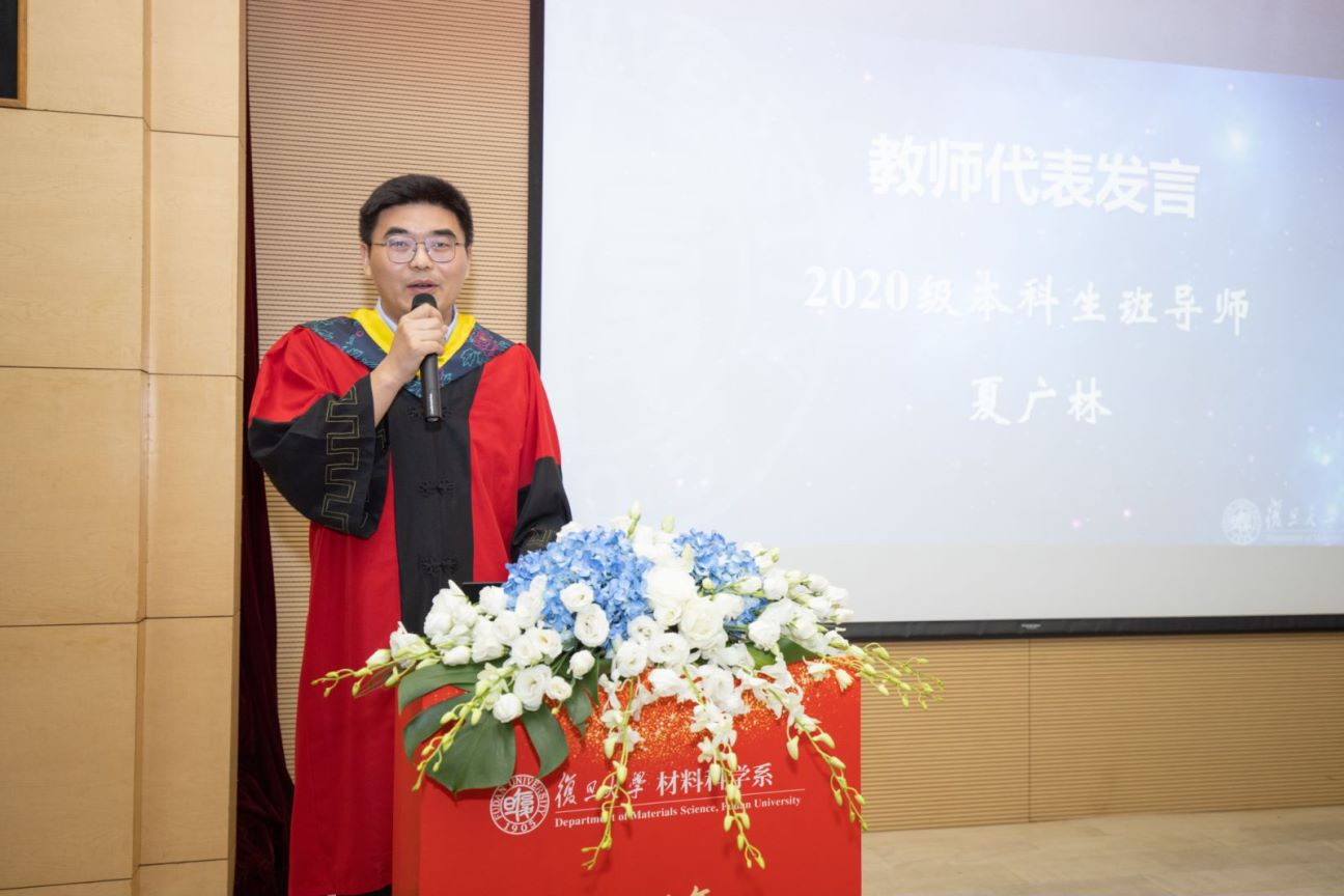 随着激昂的国歌声奏响,典礼也正式拉开帷幕。春风化雨,润物无声,教师代表夏广林首先向毕业生们送上殷切祝福。作为2020级本科生班的班导师,他回顾了四年来和同学们共同度过的学习生涯,并对同学们的顺利毕业表示热烈祝贺,也期待同学们常回家看看。