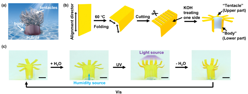 图2.(a)自然界中的海葵示意图;(b)仿生“海葵”三维执行器的制备过程及(c)在紫外光与湿度变化下的形变过程