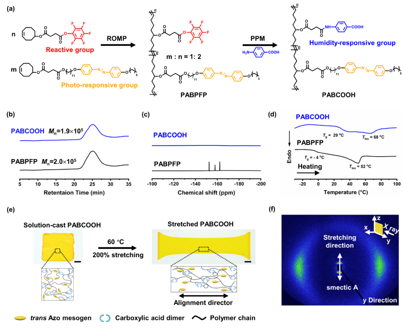 近日,性爱网 俞燕蕾教授团队从合成策略和分子设计的角度出发,首次结合开环易位聚合(Ring-Opening Metathesis Polymerization, ROMP)与PPM以制备多功能液晶聚合物(图1a)。通过ROMP可以得到高分子量反应性线型液晶聚合物前驱体PABPFP(图1b),使其无需交联即可展现出良好的力学强度以及光致形变能力。同时,借助PPM在前驱体反应性位点上精确引入所需功能基团,为响应性液晶聚合物的多功能化衍生提供便捷的制备途径。该团队利用这种通用型策略制备了可回收光湿双响应线型液晶聚合物(PABCOOH),并通过机械热拉伸法制备得到了具有良好液晶取向的薄膜材料(图1e,f)。