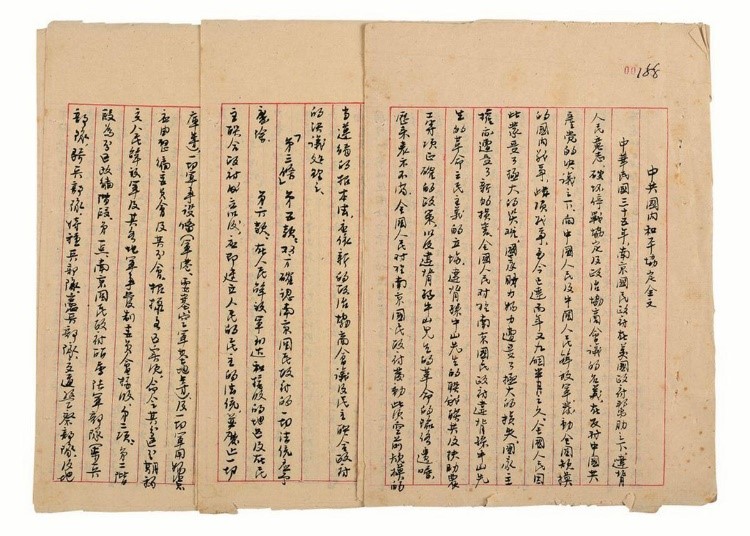 1949年4月13日,国共两党代表在中南海举行正式会谈,共同磋商《国内和平协定》(草案)。周恩来指出,和平协定草案中必须首先分清是非,说明发动内战的责任在南京国民党政府方面。“中共对一切战犯,不问任何人,只要能认清是非,幡然悔悟,出于真心实意,确有事实表现……准予取消战犯罪名,给予宽大待遇。”张治中等表示原则上接受草案。