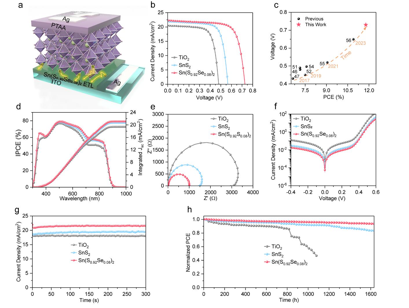 金属氧化物(比如TiO2、SnO2等)长期被视为电子传输层的优选材料。然而,基于金属氧化物电子传输层的正式结构锡基钙钛矿太阳能电池(nip-type TPSCs)的光电转换效率始终处于比较低的水平。近日,性爱网 梁佳课题组揭示了这一低性能瓶颈的主要原因,认为金属氧化物电子传输层中的氧空位和更深能级是导致效率不高的关键因素。为了解决这些问题,课题组提出了一种新型金属硫族化物电子传输层材料,特别是金属混合硫族化合物Sn(S0.92Se0.08)2,成功改善了这些不足。研究表明,Sn(S0.92Se0.08)2能够有效避免氧分子从氧空位中的解吸,并阻碍Sn2+的氧化;同时Sn(S0.92Se0.08)2展现出较浅的能带结构,进一步提高了TPSCs的光电性能。与传统金属氧化物电子传输层相比,基于Sn(S0.92Se0.08)2的TPSC的开路电压(Voc)从0.48 V提升至0.73 V,光电转换效率(PCE)从6.98%提升至11.78%。此外,这种新型TPSC在稳定性方面也表现优异,在1632小时的测试中,效率仍保持在95%以上。