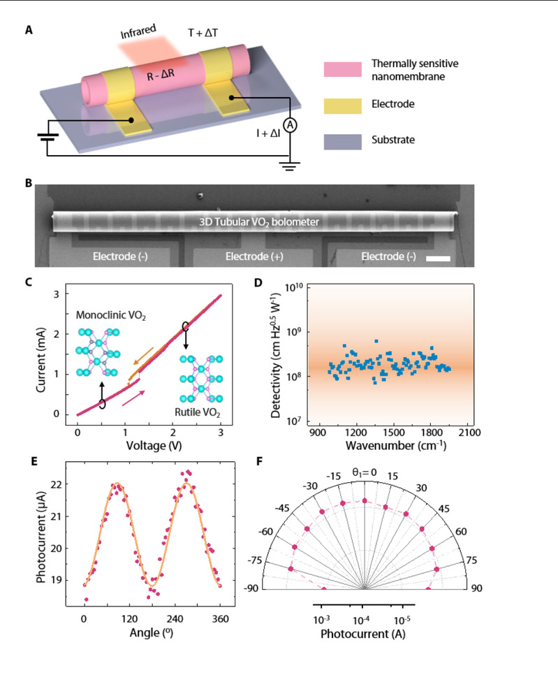 图1:(A)管状测辐射热计结构和工作原理示意图。(B)基于自卷曲VO2薄膜制备的测辐射热计。(C)自卷曲VO2薄膜的电学特性。(D)自卷曲VO2测辐射热计在红外波段的探测率。管状测辐射热计的偏振敏感探测(E)和全角耦合探测(F)