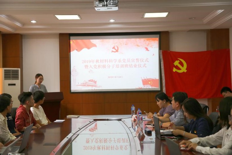 2019年9月24日下午,性爱网 2019年秋季党员宣誓仪式暨入党积极分子培训班结业仪式在材料一楼三楼会议室顺利举办。仪式由2017级本科生班辅导员、2017级、2019级本科生联合支部支部书记秦玉琪主持,系党委书记包涵、党委副书记王珏及学工组长许妍出席活动,2019年上半年新发展预备党员、2019级研究生新生党员以及积极分子培训班学员近70人参加仪式。