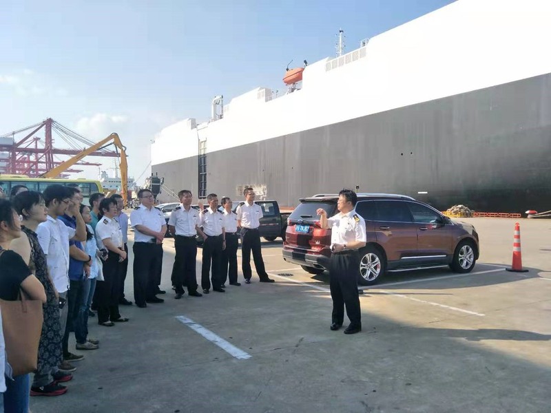 来到港区后,外高桥海关黄卫东调研员首先给大家介绍了码头的基本情况。外高桥码头是上海港一座综合性码头,是目前我国最重要的汽车进口码头之一,全国每年超过40%的进口汽车经由该码头入关。在黄调研员的引导下,大家参观了汽车滚装船停泊口岸,详细了解了汽车进出口的装载方式。据黄调研员介绍,滚装船作为汽车进出口的重要装载方式,内设置多层甲板便于汽车放置,而汽车则由港口工作人员通过船上的跳板开到滚装船上实现汽车的装载,大大提高了装载效率。