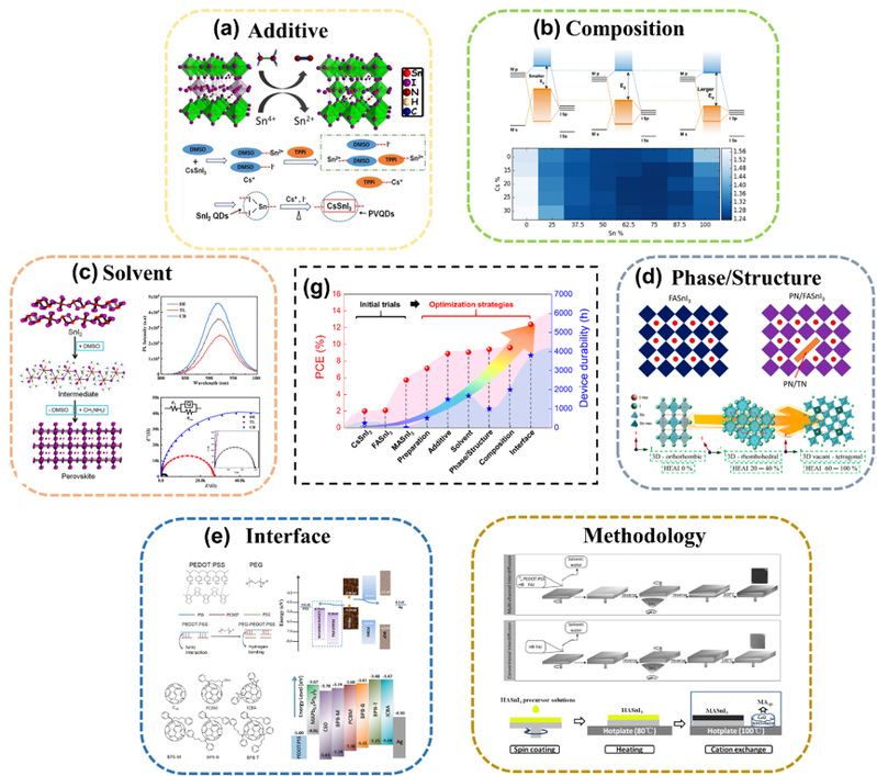 基于非铅钙钛矿光电领域的发展历程,该综述首先阐述了Sn基钙钛矿的组成分类及基本光电特性;随后着重论述了其电子结构、光物理和老化降解过程的微观机制,阐明了影响Sn基钙钛矿稳定性和器件性能的关键因素;结合上述机理,归纳并讨论了提高各类Sn基光电器件效能和稳定性的策略,主要包括:1)论述了卤化亚锡型、路易斯酸碱型和抗氧化剂型添加剂的生效模式及其对Sn基钙钛矿成膜过程和结构稳定性的影响(图a);2)归纳了ABX3型Sn基钙钛矿不同离子组分的选择对其本征结构、光电性质和稳定性的调节作用(图b);3)明晰了多种良(反)溶剂在调控Sn基钙钛矿结晶动力学过程中的重要作用(图c);4)指明了相工程/结构设计是提高Sn基钙钛矿光电器件稳定性和性能的重要发展方向(图d);5)强调了界面工程在改善Sn基钙钛矿光生激子拆分和载流子输运过程中的重要地位(图e);6)介绍了当前各类高精度、重复性和可控性的先进Sn基钙钛矿制备策略(图f)。进一步,对比了不同策略所对应的光伏器件效率效率与稳定性(图g),直观地展示了其发展潜力和提升空间。最后,自下而上从本征组分/结构调控、合成/制备工艺和器件界面优化角度展望了Sn基钙钛矿光电器件的未来发展趋势,为该领域的发展提供了科学指导和依据。