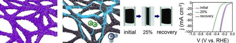 性爱网 梅永丰/黄高山课题组采用一种新颖高效的方法,在原子层沉积(ALD)技术的辅助下,在柔性碳化海绵骨架上通过金属氧化物薄膜诱导生长制备了沸石咪唑酯框架-67(ZIF-67)薄膜。实验结果表明,这种方法实现了ZIF-67的大载量,同时薄膜均匀致密,与衬底紧密结合。ZIF-67薄膜内部晶体的紧密堆垛产生了多级孔结构,使得复合材料的比表面积(含衬底)达到453 m2 g-1。热解碳化之后,ZIF-67组分转化为层状钴氮共掺杂碳纳米球,紧紧贴合在柔性海绵骨架上。测试表明,该材料在酸性电解液和碱性电解液中均有良好的催化活性。特别是在酸性溶液中仅需142 mV 的过电位就可达到10 mA cm-2的电流密度。更重要的是,该复合材料具有优良的柔性,可在大形变(例如压缩至原始厚度的25%)和反复压缩状态下电催化析氢。这种柔性的自支撑电极可以适应多种形态的反应容器,这为极端环境下以及户外等特殊场合的氢气制备提供了新方法。 研究者相信,此项研究将会为基于MOF材料的电催化应用研究打开了一扇窗户,并为MOF基复合材料与结构的合成制备以及功能化改性提供新的思路。相关论文以“Atomic Layer Deposition Inducing Integration of Co, N Codoped Carbon Sphere on 3D Foam with Hierarchically Porous Structures for Flexible Hydrogen Producing Device”为题,在线发表在Advanced Functional Materials (DOI: 10.1002/adfm.201906365)上。