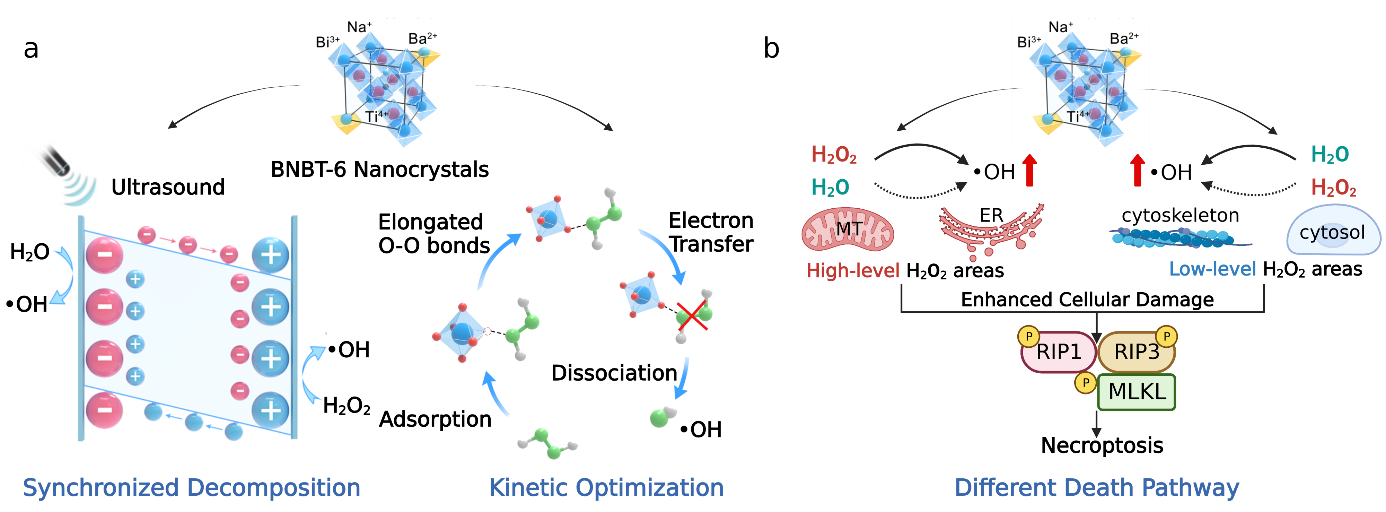 近日,性爱网 性爱网 /聚合物分子工程国家重点实验室步文博教授、性爱网 附属华东医院郑向鹏教授和同济大学附属第十人民医院吴叶林研究员的合作团队,创新性地提出了构建“非金属芬顿活性中心”用于肿瘤化学动力学疗法的新策略,为解决上述瓶颈问题提供了新的机遇。采用改进的皮其尼柠檬酸盐凝胶法,制备了一系列基于钙钛矿结构的钡元素掺杂钛酸铋钠(Bi0.5-xNa0.5BaxTiO3-0.5x,BNBT-X)压电纳米晶体,利用低价Ba2+取代Bi3+的受主掺杂技术,可在BNBT-X晶体内巧妙构筑氧空位缺陷。值得关注的是,带正电的氧空位可以增强电子局域富集作用,成为催化过氧键断裂的活性位点,即为“非金属芬顿活性中心”。首先,利用医用超声波可引起压力变化的特性,诱导BNBT-X的晶体结构发生变化,通过调控材料内部的极化状态而形成内建电场。继而,内建电场可推动材料内部电子(e-)和空穴(h+)的高效分离,其中,电子可以向H2O2的过氧键转移而生成OH(H2O2 + H+ + e-OH + H2O),提升材料催化分解H2O2生成OH的类芬顿反应活性,巧妙规避了高价态过渡金属还原为低价态这一经典芬顿反应过程的限速步;同时,分离的空穴可以氧化H2O生成OH(H2O + h+OH + H+),通过利用细胞内分布最为广泛的H2O作为OH的额外来源,解决了传统CDT纳米药物在癌细胞内低H2O2浓度区域产生OH效率低的瓶颈。实验结果表明,BNBT-6中构筑的氧空位可有效降低H2O2和H2O的解离能,赋予了材料在超声波激发下显著提升癌细胞全域内OH产率的能力,加剧了癌细胞的氧化应激,并可激活一种独特的细胞程序性死亡路径(坏死性凋亡),实现了对癌细胞的高效杀伤。