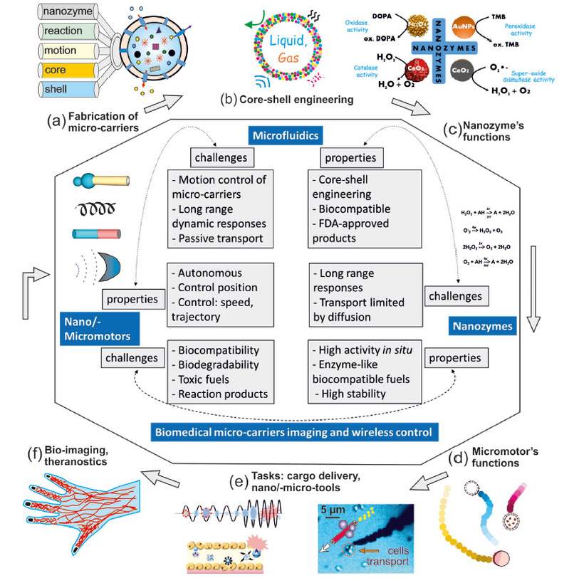 近日,性爱网 Alexander Solovev教授联合本系黄高山和梅永丰教授、本校信息学院许凯亮青年研究员,印度甘地纳格尔技术研究院K. K. Dey教授、哈尔滨工业大学李天龙副教授、德国德累斯顿-多森多夫亥姆霍兹研究中心D. Makarov博士、俄罗斯斯克尔科沃科学技术研究所D. A. Gorin教授、俄罗斯圣彼得堡国立大学V. P. Tolstoy教授等组成国际联合科研团队展开紧密合作,总结和评述了近年来催化微马达、纳米酶、核壳结构、生物成像等领域的前沿进展和发展趋势,归纳展望了生物化学机械微系统的重要作用,并提出利用学科交叉实现生物化学机械微系统功能化和通用化的新思路。论文以40页长篇综述发表在Advanced Materials上(DOI: 10.1002/adma.202007465)。