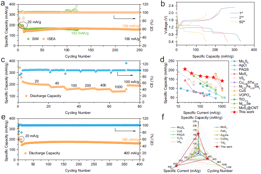 图1. 经过ISEA处理后的CuSe||Mg电池电化学性能以及与其他已报道的储镁正极材料性能对比