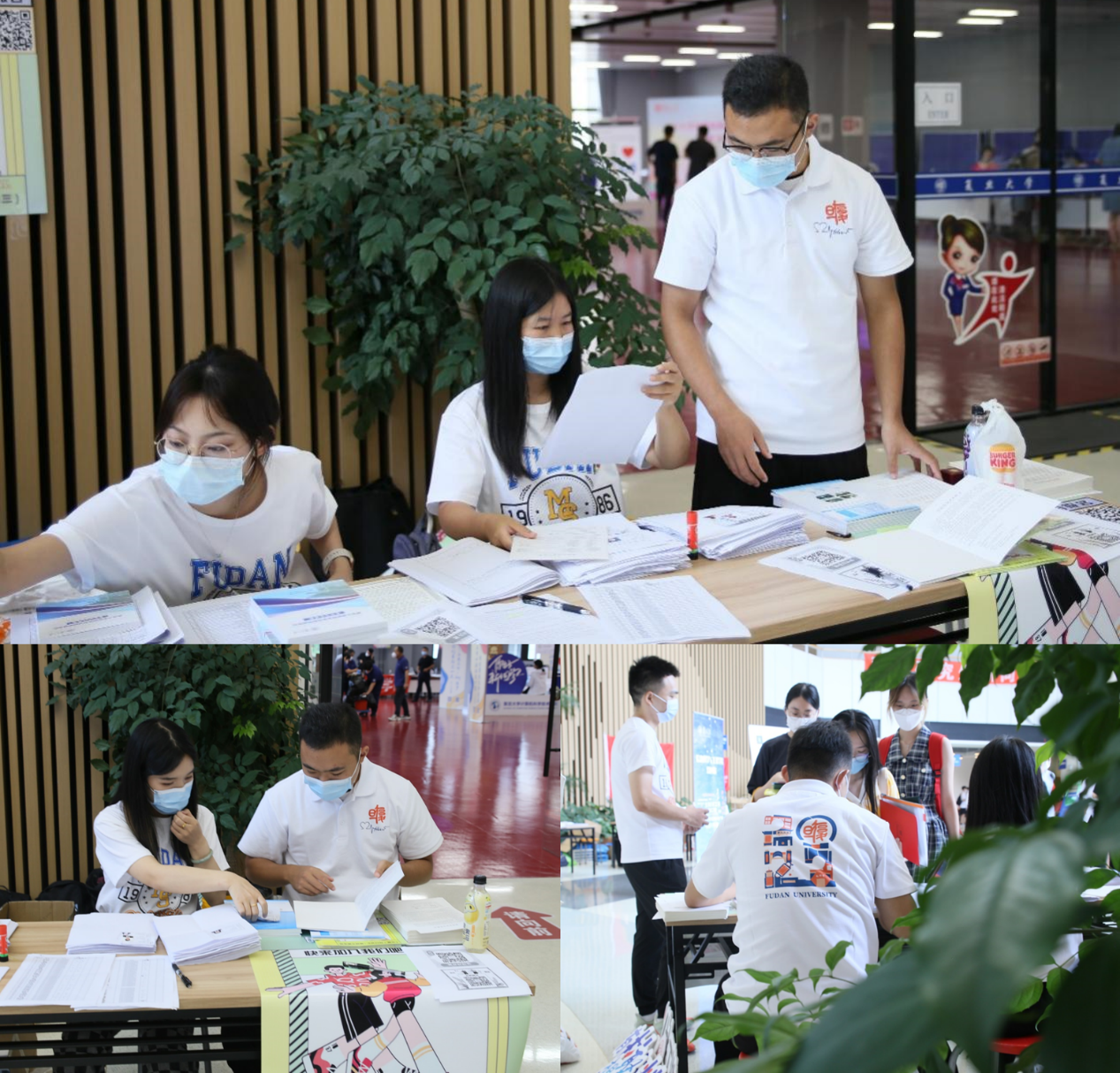 的研究生新生的报到日,为保证新生报到流程高效有序,迎新志愿者们早早来到体育馆开始布置迎新摊位。
