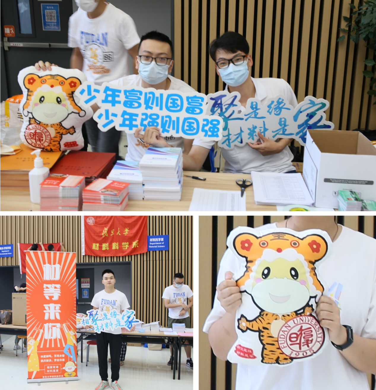 我们不仅为报到的新生同学们立起了欢迎海报,还精心准备了具备材料特色的KT板及系宠抱枕作为拍照留念的道具。